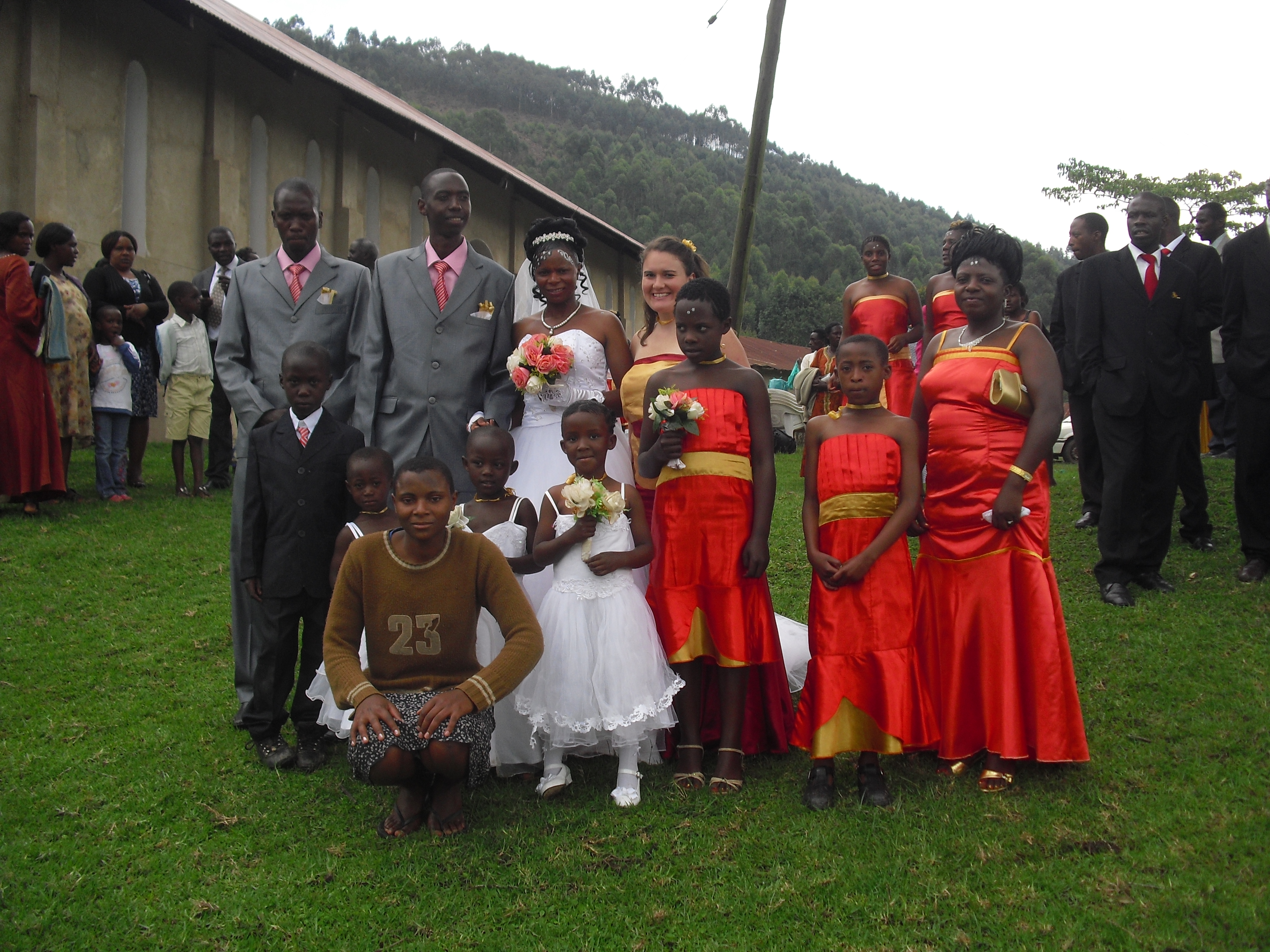 Here Friday afternoon/evening was the Give Away/Introduction party. (I seem to get different answers everytime I try to ask about the distinction between the two, and I have decided they were a two-in-one package for this wedding.) It involved a big lunch, singing, dancing, exchanging gifts between the couple and their families as well as the maids and other guests giving gifts, a brief message from a pastor (Dr. Rev. Ben Tumuheirwe for those of you who konw him), cake, and many other things I am sure I missed or didn’t totally understand since it was all conducted in Rukiga. The only time there was really English that day was when the m.c. was encouraging the bridesmaids to smile, and thanking me for smiling, from the microphone. The wedding ceremony in the church was the next morning. Then we drove 2 1/2 hours to the groom’s village for a party there. (We crammed over twenty adults and children in a 15-passenger van to get there.)
