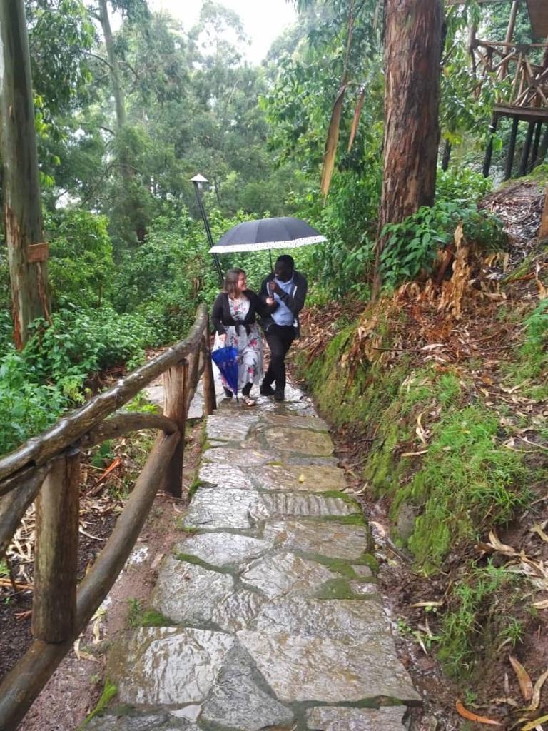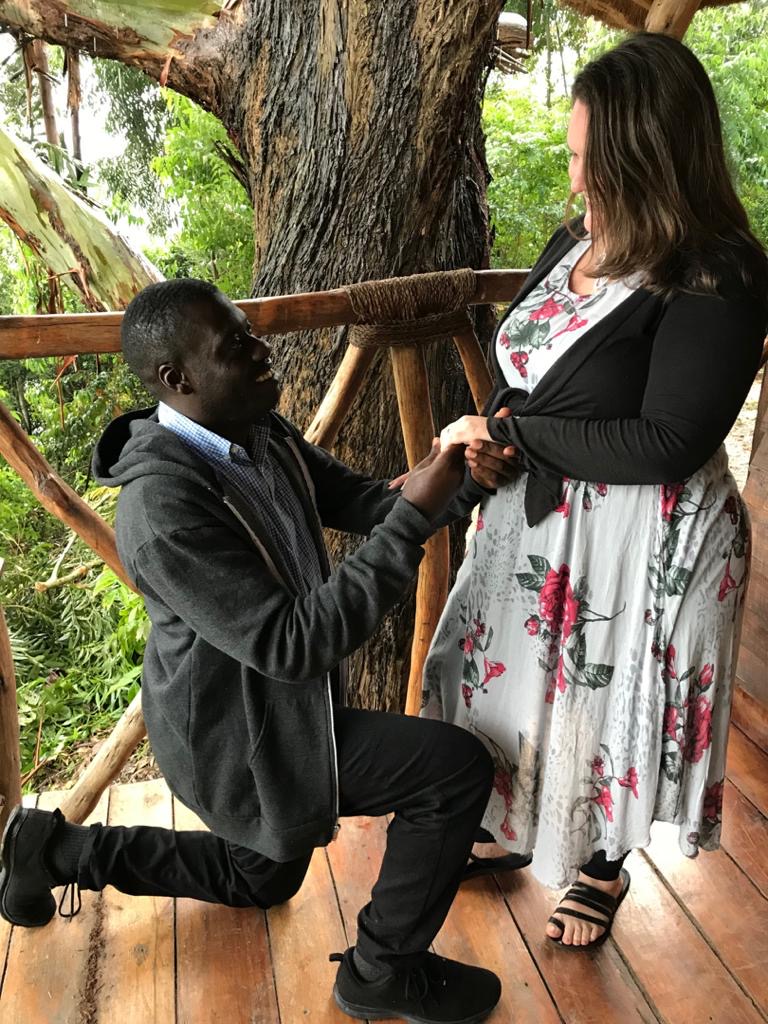 This time, as we took the short boat ride to the island, it began to sprinkle. By the time we reached the restaurant at the top of the hill, it was raining hard. We ordered lunch and I watched Patrick stare at the dark clouds and try to wish them away. They were not going anywhere. Eventually he gave up his hopes of taking a hike and looking for zebras along the way. Instead, with an umbrella in hand, we walked down a slippery path to a cabin along the lake. There he took a ring out of his pocket, got down on one knee, and asked me to marry him. I happily said yes. Though it wasn’t exactly as Patrick hoped, it was just perfect for us, and is definitely a day we won’t forget! As Ugandans say, rain is a sign of a blessing, so we will happily take that blessing as we move towards marriage.